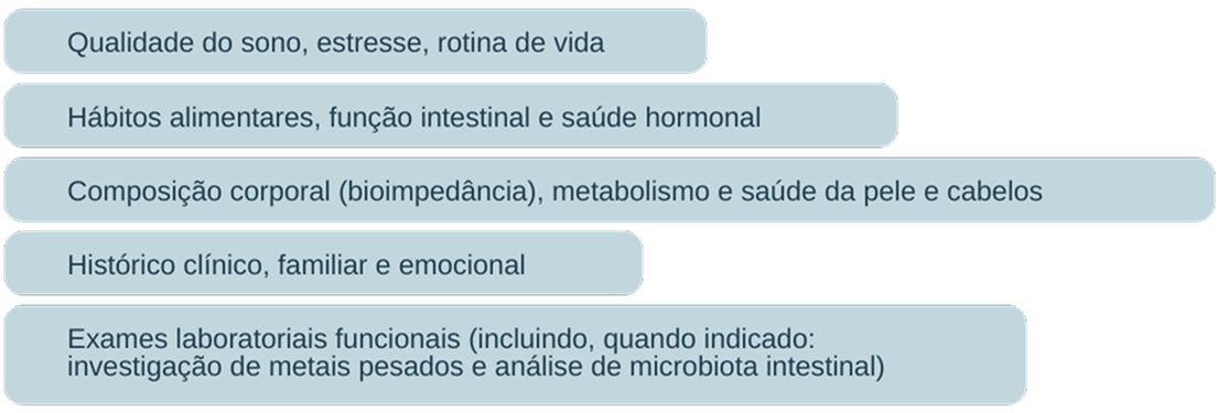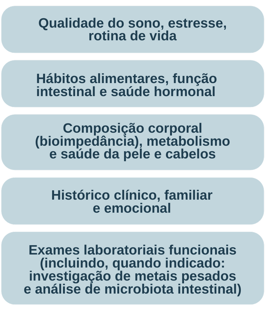 Realizo uma avaliação integral que contempla histórico clínico e familiar, rotina, sono e estresse, hábitos alimentares, função intestinal e aspectos hormonais. Conforme a queixa, podem ser incluídos: